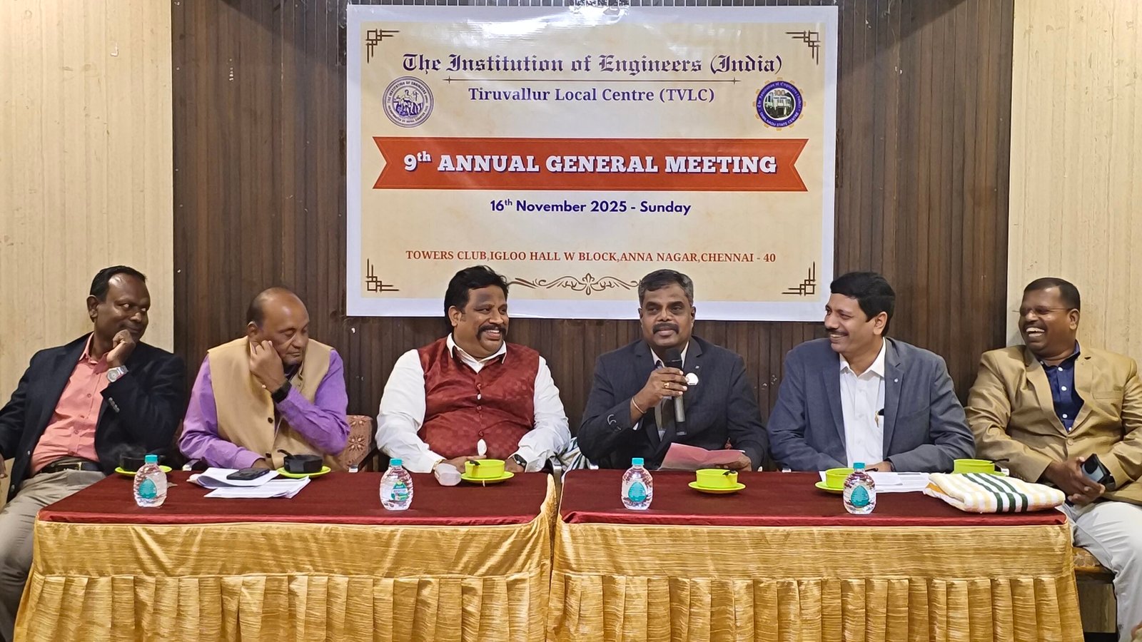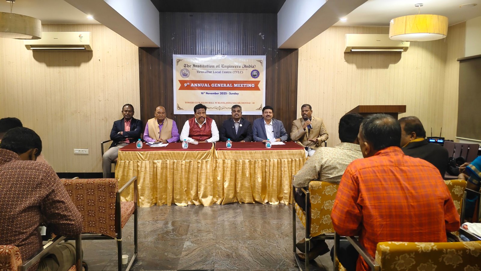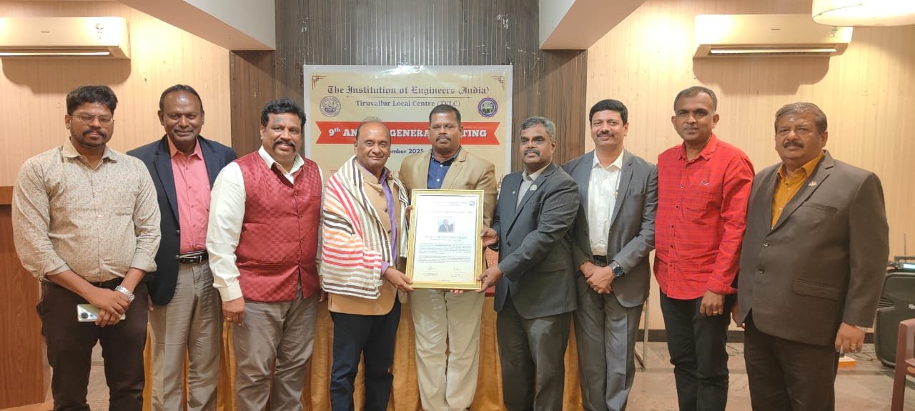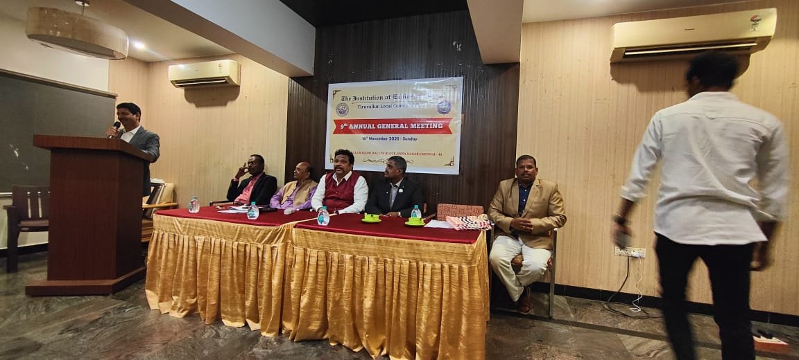 The 9th Annual General Meeting (AGM) of the IEI Tiruvallur Local Centre was held on 16th November 2025 at 6:30 PM at the Towers Club, Igloo Hall, Anna Nagar, Chennai. The meeting began with a warm welcome address by Dr. J. Balamurugan, FIE, Chairman (2023–2025), after which the formal agenda items were taken up.