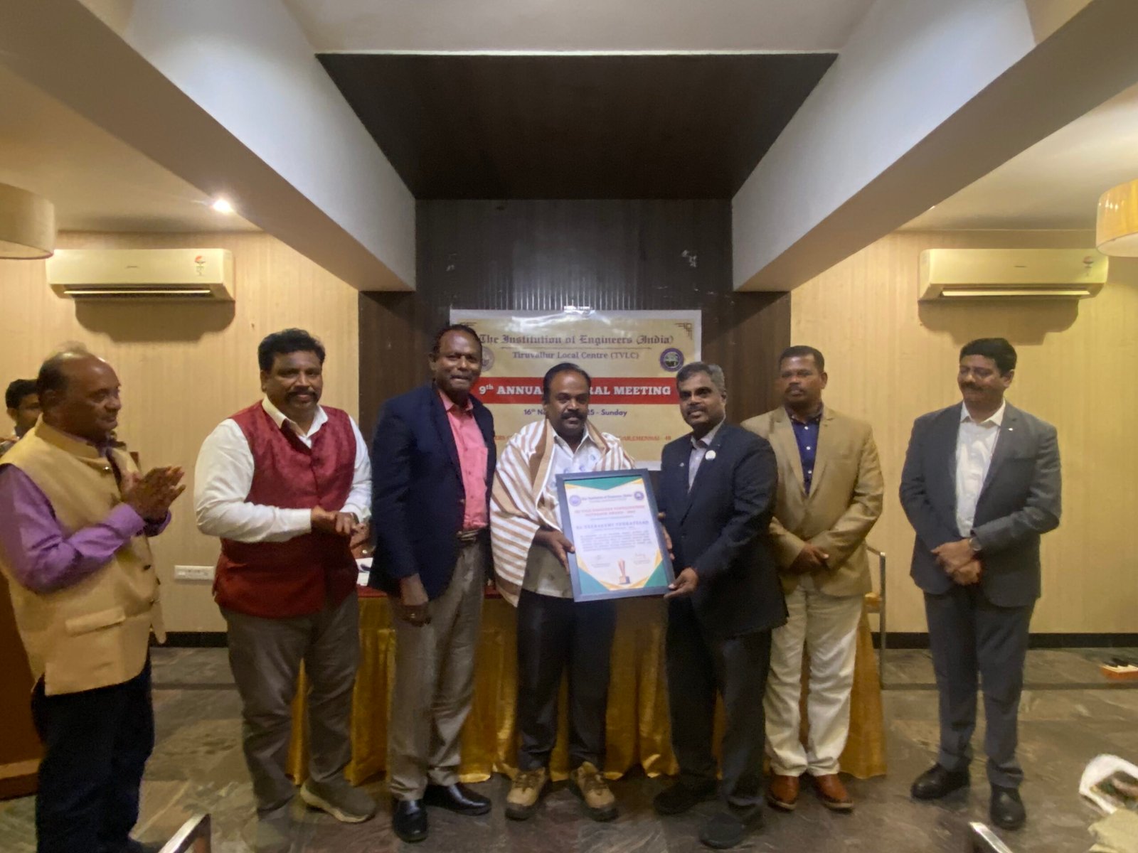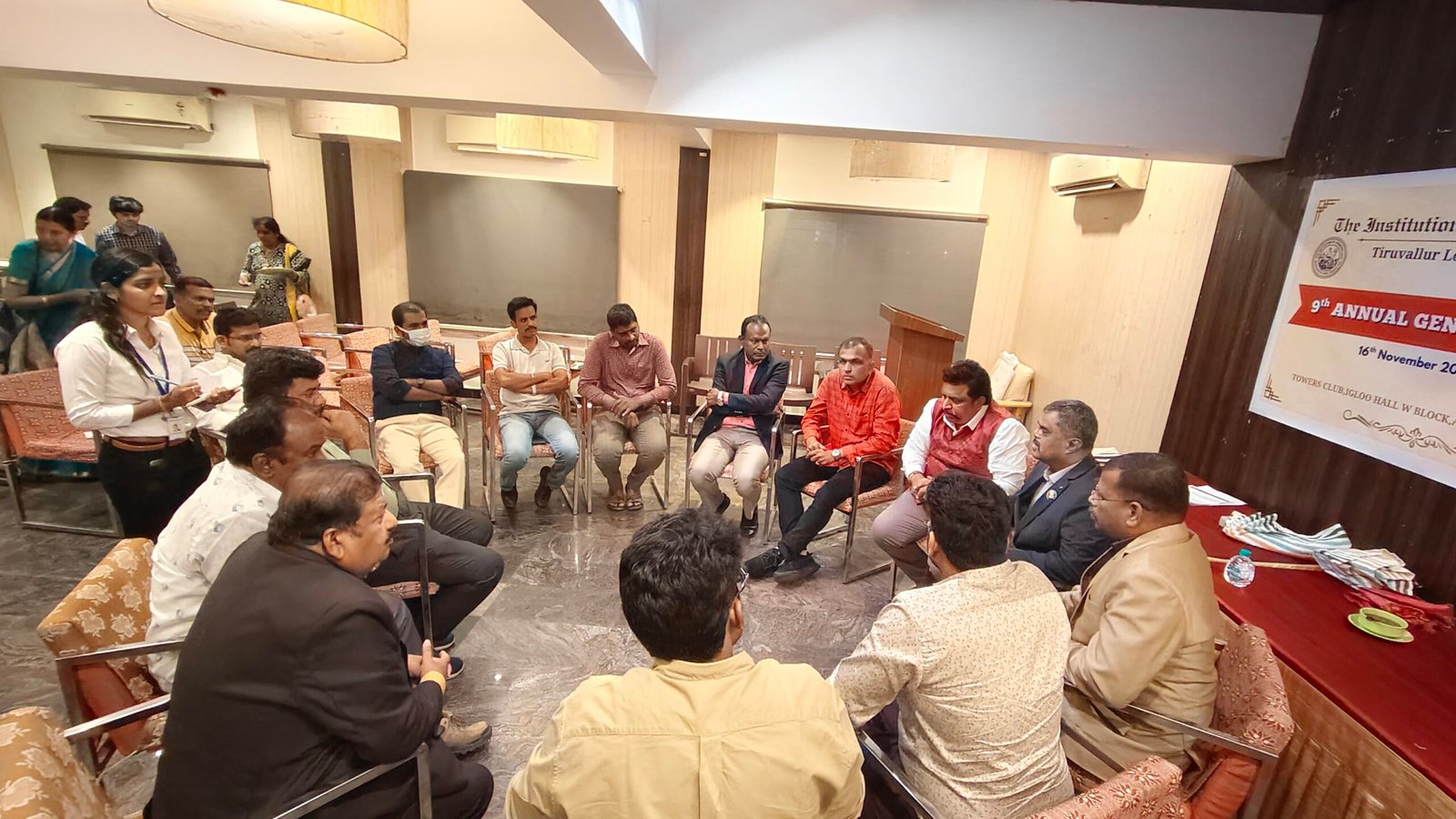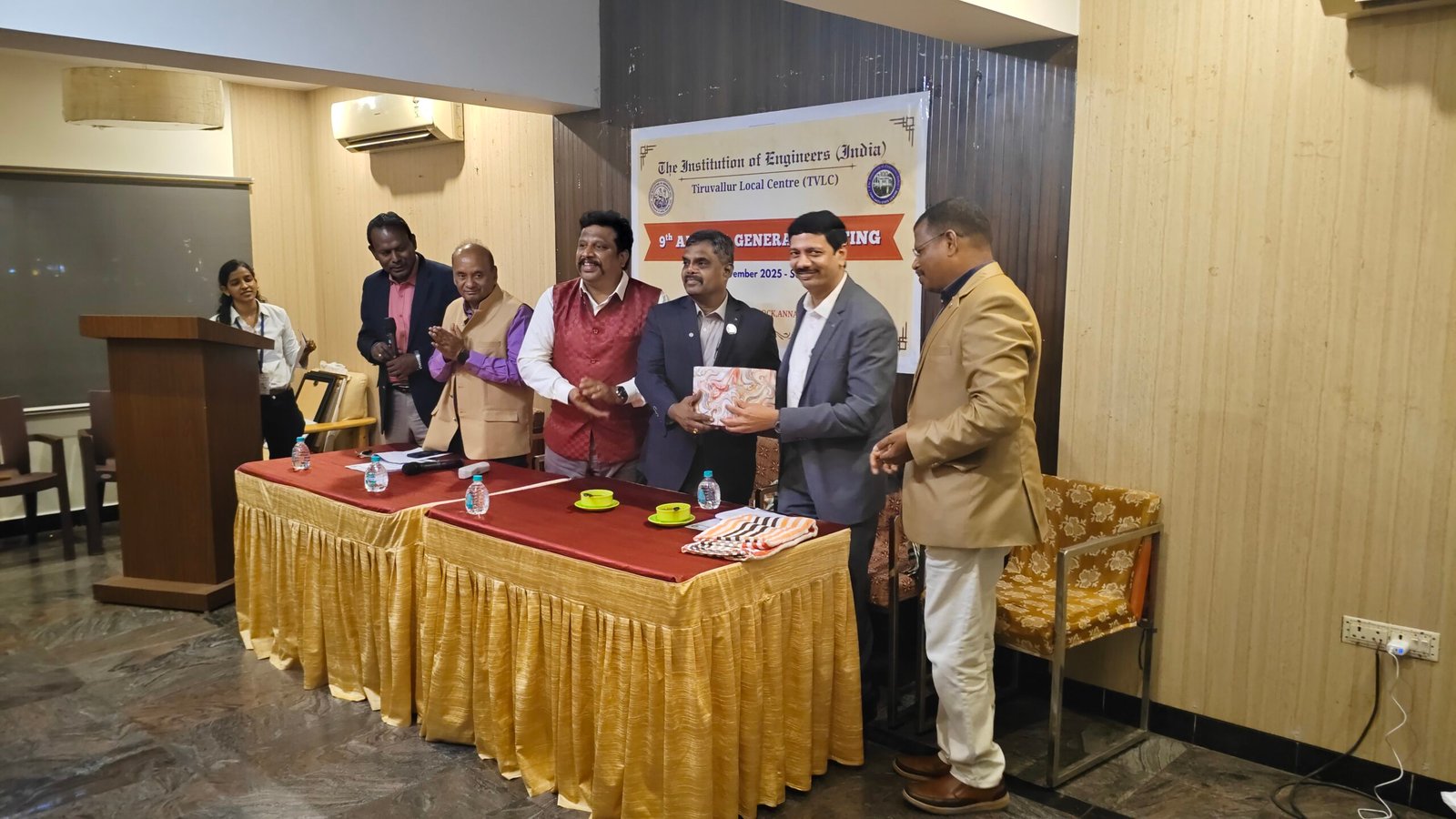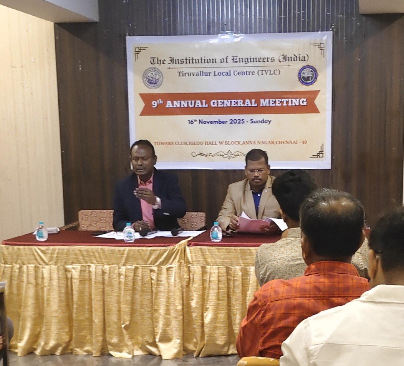 The 9th Annual General Meeting (AGM) of the IEI Tiruvallur Local Centre was held on 16th November 2025 at 6:30 PM at the Towers Club, Igloo Hall, Anna Nagar, Chennai. The meeting began with a warm welcome address by Dr. J. Balamurugan, FIE, Chairman (2023–2025), after which the formal agenda items were taken up.